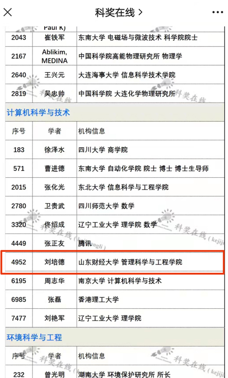 在计算机科学与技术学科前10名学者的榜单上,刘培德位列第7。