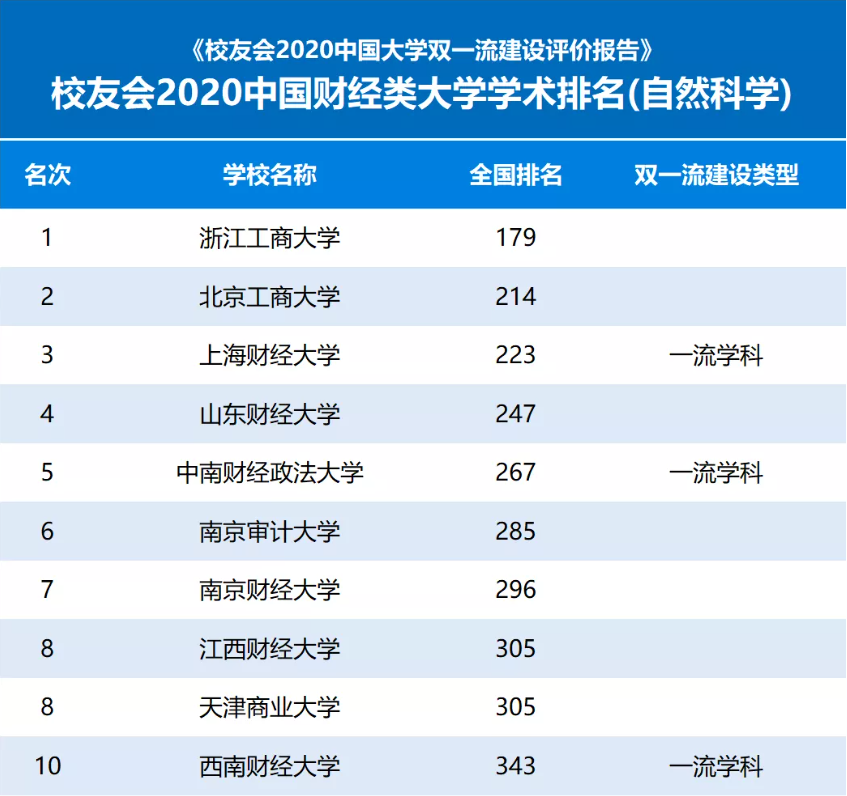 报告显示,在最新校友会2020中国大学学术排名中,浙江工商大学、北京工商大学、上海财经大学、山东财经大学、中南财经政法大学、南京审计大学、南京财经大学、江西财经大学、天津商业大学、西南财经大学勇夺2020中国财经类大学学术排名(自然科学)前10强。