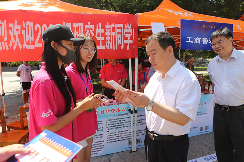 党委书记王邵军、校长赵忠秀、党委副书记赵友春等校领导先后来到燕山、舜耕两个校区检查指导迎新工作,与研究生新同学亲切交谈、合影留念,并慰问参加迎新工作的师生员工,同时,深入了解各学院招生情况和教育教学安排。