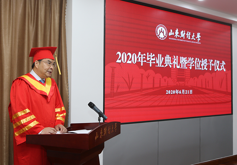 疫情挡不住毕业季美好,疫情隔不断财大学子对母校的依依惜别之情。6月21日上午,山东财经大学2020年毕业典礼暨学位授予仪式隆重举行。校党委书记王邵军,校长赵忠秀,副校长綦好东、韩作生、陈晓兰、张书学、张新以及部分职能部门负责人、本科生、硕士和博士研究生30余名毕业生代表在现场参加典礼。校党委副书记赵友春主持了典礼和仪式。