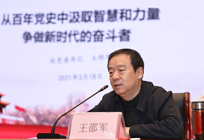 王邵军指出,在庆祝我们党百年华诞的重大时刻,在全党开展党史学习教育,正当其时,十分必要。这是以史鉴今、资政育人的精神洗礼,这是回望奋斗路、眺望奋进路的进军号角,必将汇聚起党群同心、干群齐心、万众一心的磅礴伟力。希望全校每一名师生积极参加学习,接受教育,努力做到学史明理、学史增信、学史崇德、学史力行,做到学党史、悟思想、办实事、开新局。