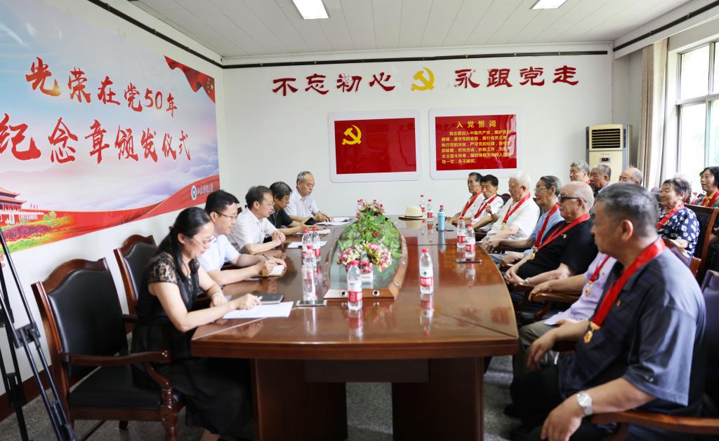 会上通报了学校“光荣在党50年”纪念章99名获得者名单。党委组织部、党委宣传部、离退休工作处负责同志参加了仪式。
