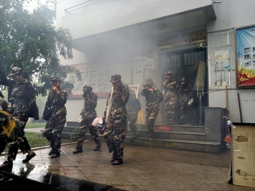 开始,由保卫部向同学们介绍普及消防安全知识,介绍消防事故发生时的逃生方法,告诉同学们在发生火灾时不能慌张,要沉着冷静,用湿毛巾捂住口鼻,弯腰贴墙,快速的由逃生通道逃往操场安全区域,不可留恋财物等身外之物,要保证自己的安全。演练起初,保卫部人员模拟火灾现场,吹烟进行探头报警。报警声响,同学们在党委学生工作部、保卫部的指挥下,按照之前的培训知识,用湿巾捂住口鼻,沉着冷静,有序快速地撤离了模拟火灾现场。