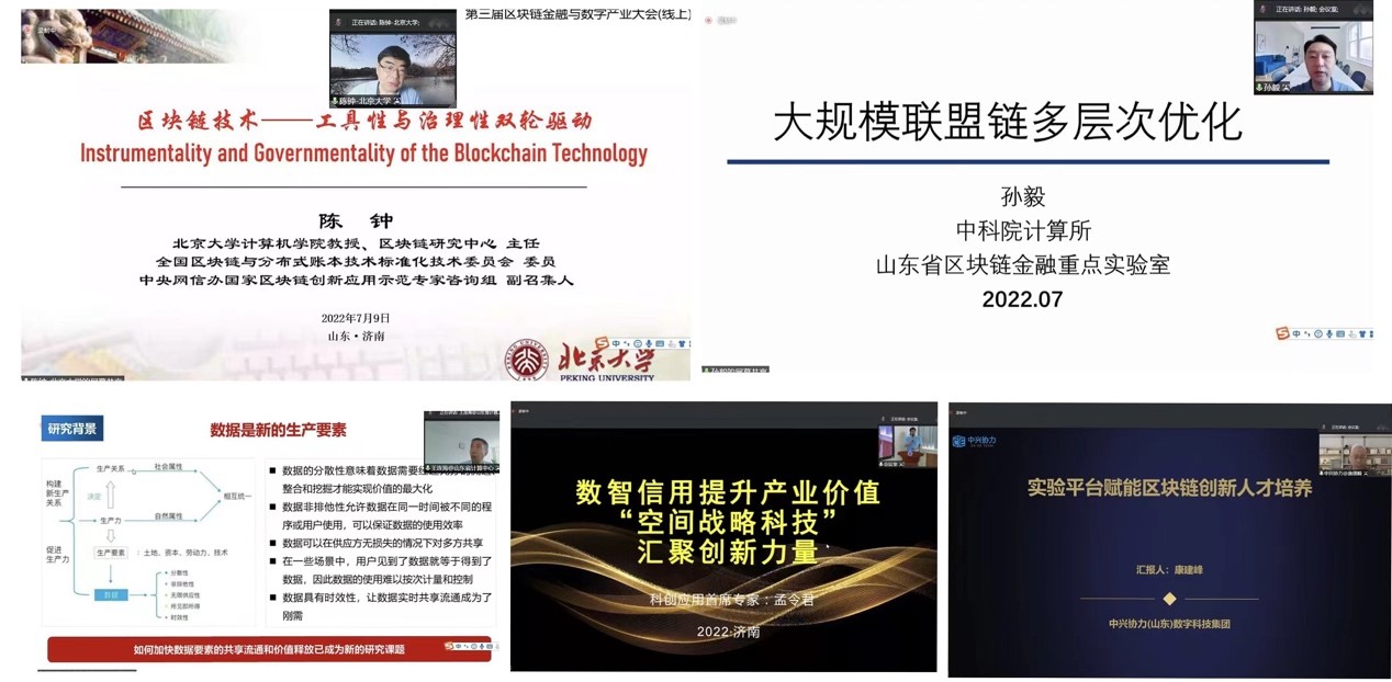 本届会议紧密围绕区块链与数字金融、区块链与虚拟教育、实体经济数字化、区块链提升金融服务促进数字产业发展等相关问题进行了5场学术报告和业界案例分享。北京大学区块链研究中心主任陈钟教授做了《区块链技术的工具性与治理性双轮驱动》的学术报告,山东省区块链金融重点实验室首席专家、中科院计算所孙毅研究员做了《大规模联盟链多层次优化》的学术报告,山东省计算机网络重点实验室副主任、山东省区块链工程技术研究中心副主任王连海二级研究员做了《区块链赋能数据要素价值释放》的学术报告,山东高速集团财务高级经理、集团共享中心科技创新首席高级专家孟令君做了《数字信用提升产业价值“空间战略科技”汇聚创新力量》的案例分享,中兴协力(山东)教育科技集团技术总监康建峰做了题为《实验平台赋能区块链创新人才培养》的案例分享。