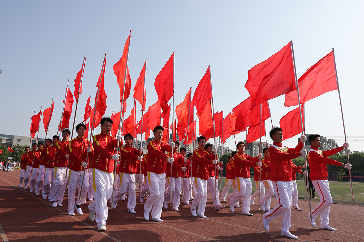 伴随着《运动员进行曲》激扬旋律,红旗队、花束队、各学院代表队高喊嘹亮口号,迈着整齐的步伐依次走过主席台。随后,举行了庄严的升国旗唱国歌仪式。