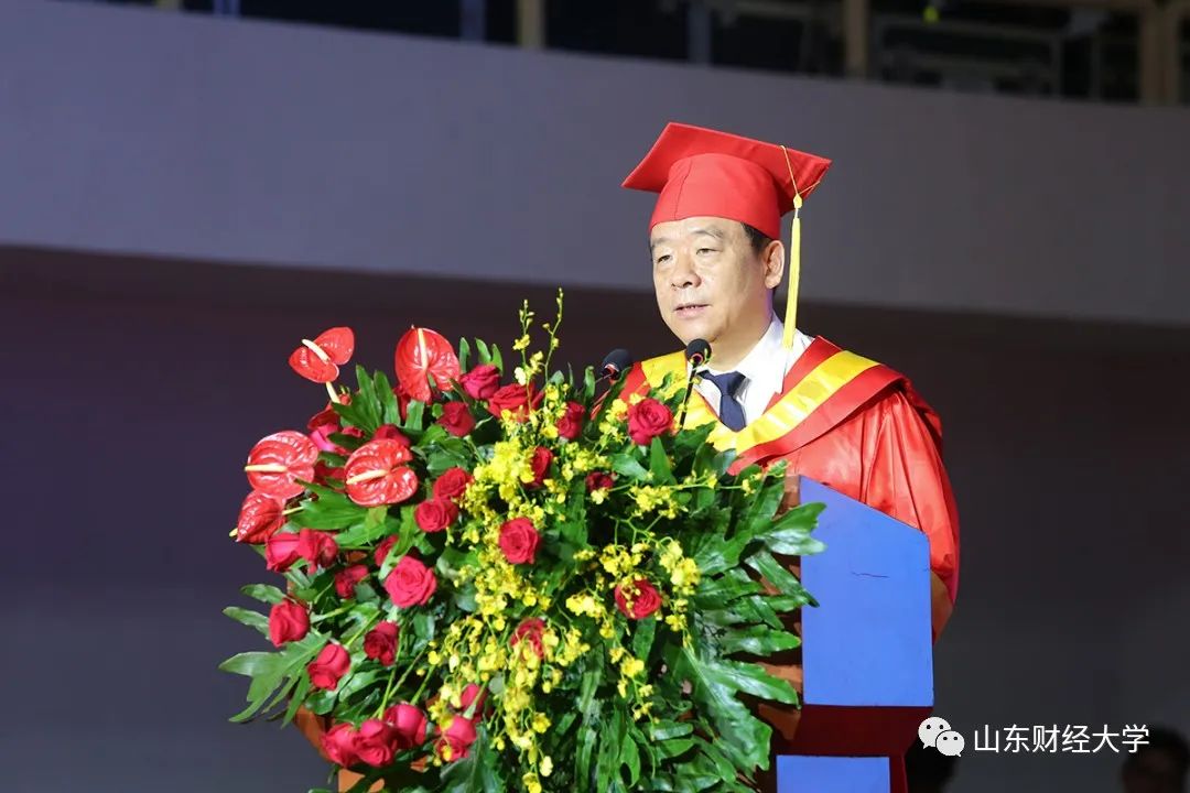 四年来,你们参与和见证了山财大的发展。你们在读期间,正是学校扎实推进内涵建设、不断提高办学质量、办学实力持续提升的关键时期。学校入选了山东省高水平大学建设名单,连续三年在具有博士学位授予权的省属I类高校年度考核中获“优秀”等次,社会声誉和影响力持续攀升。特别是去年,你们亲眼见证了建校70周年和合并建校10周年隆重庆典。这一时期,学校坚守初心,立德树人,全力推进新财经教育教学改革。获批国家级一流本科专业建设点29个,国家级一流本科课程33门;在刚刚公布的第二批国家级一流本科课程中,总量位居省属高校及全国财经类院校第一、全国高校第46位。同时,在全国“互联网+”“挑战杯”“创青春”等高水平竞赛中屡获嘉奖,人才培养质量得到新的提升。这一时期,学校抢抓机遇,重点突破,着力打造学科雁阵梯队。3个学科入选山东省高峰学科和高水平学科建设名单,应用经济学进入软科“中国最好学科”排名前10%,学科实力冲进并稳居全国财经高校前十。这一时期,学校立足百年学府,悦纳英才,持续优化办学条件。我们的主校区图书馆拔地而起,成为经十东路上的璀璨明珠,教学楼、宿舍楼焕然一新,网红餐厅美食荟萃,文化活动中心设施先进,学习生活环境越来越好。学校各项事业的快速发展,凝结着同学们的勤奋与努力。感谢你们对学校工作的支持与理解,感谢你们为学校事业发展增光添彩。你们是好样的!财大有你们,幸甚至哉!
