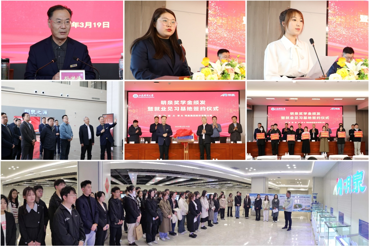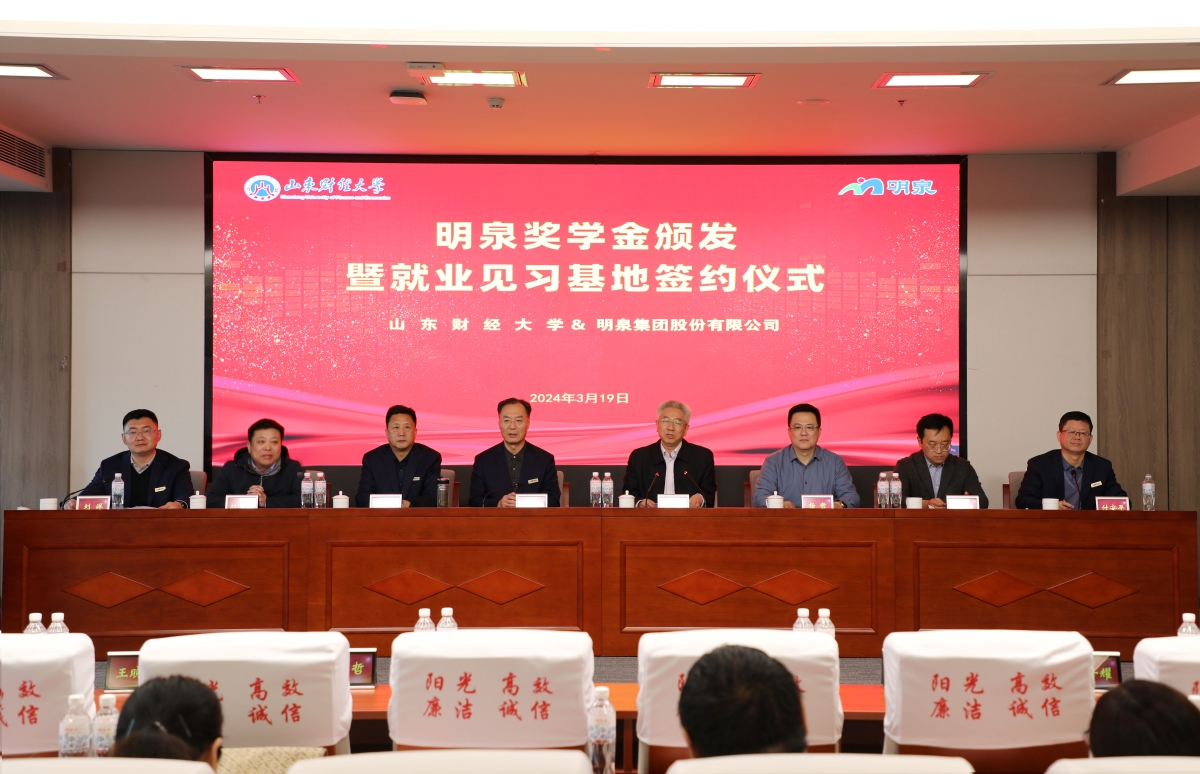 3月19日,明泉奖学金颁发暨就业见习基地签约仪式在明泉集团股份有限公司举行。副校长张新、山东明泉集团股份有限公司党委书记兼董事局主席孙洪海出席仪式。学校相关职能部门负责人,获奖学生代表,及明泉集团职工代表等90余人参加仪式。