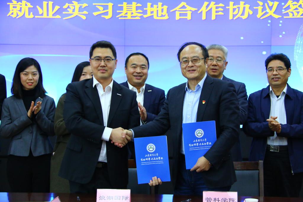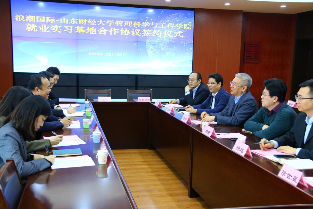 2019年12月26日,浪潮国际-山东财经大学管理科学与工程学院就业实习基地签约仪式在燕山校区逸夫楼621举行,副校长张新、浪潮国际副总裁武光利出席仪式。浪潮国际人力资源部有关领导,学校就业处、合作发展处、科学与工程学院有关负责人参加仪式。