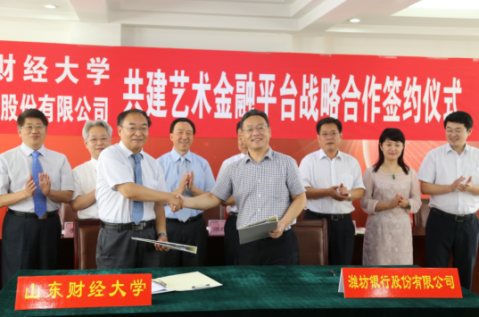 2016年7月1日上午,学校与潍坊银行共建艺术金融平台战略协议签约仪式在燕山校区举行。校长卓志、副校长胡文波,潍坊银行行长闫红兵、行长助理王远军、 首席审计官李子刚出席仪式,艺术学院院长范正红与王远军分别代表双方签订协议。校长办公室、发展规划处、教务处、学生工作处、艺术学院、金融学院相关负责 人和师生代表参加仪式。