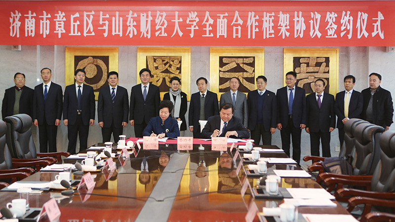 2017年12月16日上午,我校与济南市章丘区人民政府全面合作框架协议签约仪式在舜耕山庄举行。校党委书记王邵军、校长卓志,济南市副市长王桂英,章丘区委书记刘天东,区委副书记、区长韩伟,区委常委、办公室主任王士强,副区长王玉洁等出席签约仪式。党委副书记车滨代表我校与章丘区政府签署协议。双方相关部门负责人参加签约仪式。