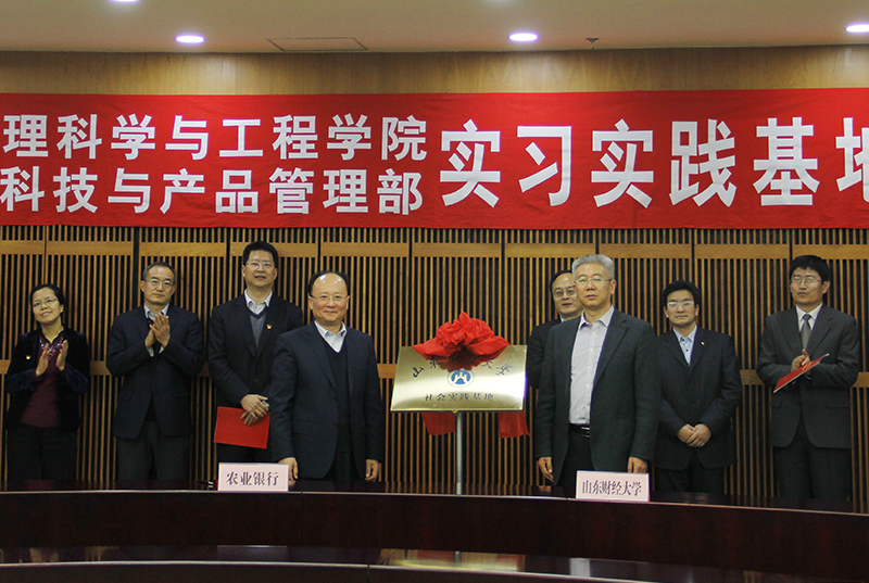 2018年1月11日,我校与中国农业银行山东省分行举行实习实践基地签约揭牌仪式。副校长张新、省农行副行长翟世勇、省农行科技与产品管理部总经理陈鹏、管理科学与工程学院相关负责人出席仪式。张新与翟世勇共同为实习实践基地揭牌。