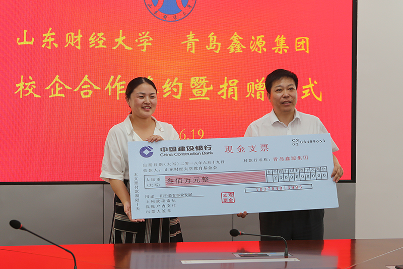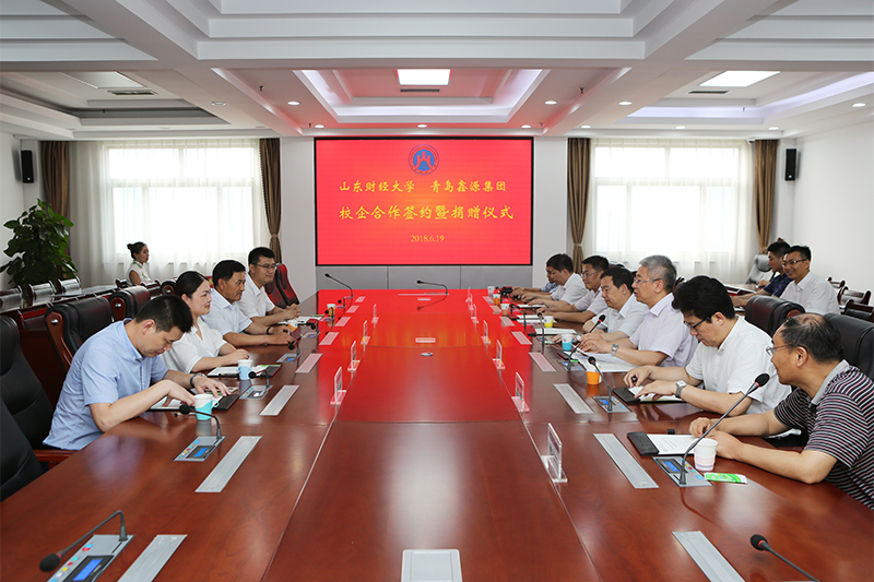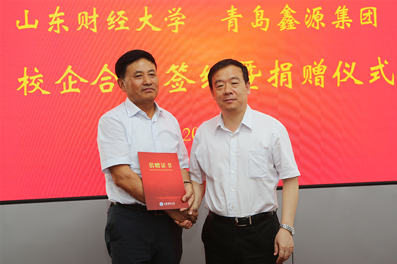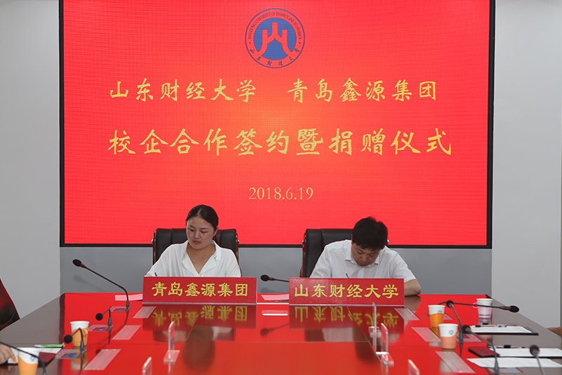 2018年6月19日下午,我校与青岛鑫源集团校企合作框架协议签约暨捐赠仪式在燕山校区举行。根据协议,我校与青岛鑫源集团共建“山东财经大学青岛创新创业园”(简称“青岛双创园”),同时,青岛鑫源集团首期捐赠300万元助力学校发展。校党委书记王邵军出席仪式并向青岛鑫源集团董事长辛熙源颁发捐赠证书,副校长张新主持仪式并致辞。