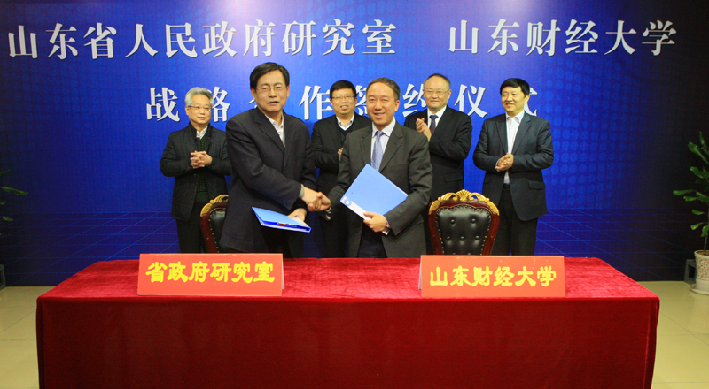 2015年2月4日上午,省政府研究室与我校战略合作协议签约仪式在舜耕校区举行。省政府研究室主任、党组书记刘险峰,巡视员聂炳华、副巡视员宋向平,我校党委书记刘兴云、校长卓志、副校长綦好东出席仪式。聂炳华、卓志代表双方签署战略合作协议。副校长胡文波主持仪式。