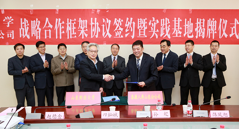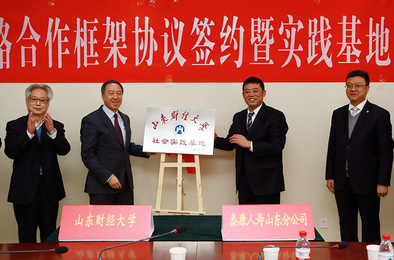 2016年1月26日上午,山东财经大学、泰康人寿保险股份有限公司山东分公司战略合作协议签约暨社会实践基地揭牌仪式在舜耕校区举行。泰康人寿山东分公司总经理田灿斌,副总经理孙超、赵德金、韩凤旭,山东财经大学校长卓志、副校长胡文波出席仪式,学校有关部门负责人和保险学院师生代表参加了签约仪式。