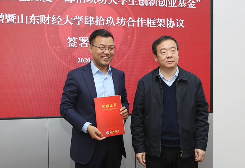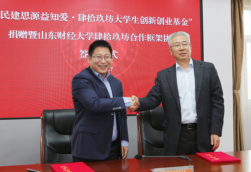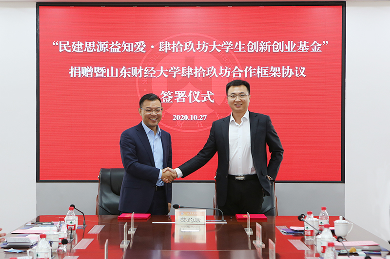 2020年10月27日上午,“民建思源益知爱·肆拾玖坊大学生创新创业基金”捐赠暨山东财经大学与肆拾玖坊校企合作协议签署仪式在我校燕山校区举行。山东省政协副主席、民建山东省委主委郭爱玲、学校党委书记王邵军和肆拾玖坊创始人张传宗等领导嘉宾出席活动。副校长张新主持活动。
