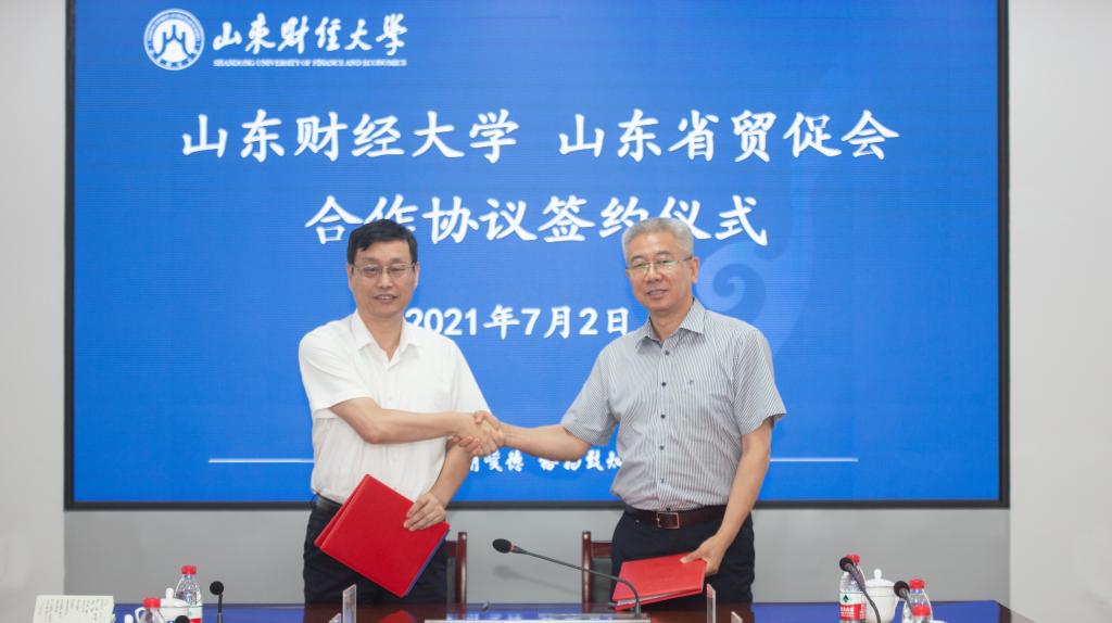 2021年7月2日,山东财经大学与中国国际贸易促进委员会山东省委员会(简称:山东省贸促会)合作协议签约仪式在燕山校区举行。山东省贸促会党组书记、会长于风贵、副会长贺忠军、秘书长陈彤,学校党委书记王邵军、校长赵忠秀、副校长张新出席签约仪式并进行座谈。王邵军、于风贵致辞,张新、贺忠军分别代表双方签约,赵忠秀主持签约仪式。