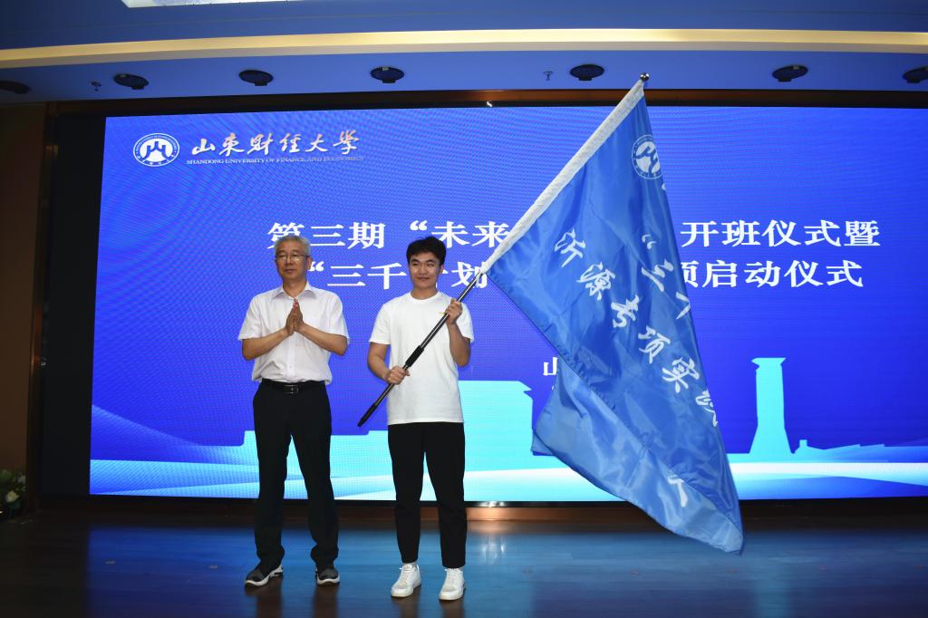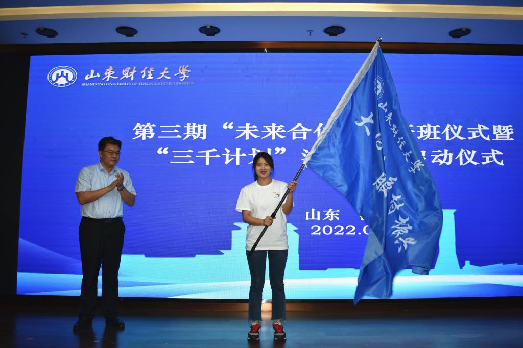仪式上,张新为2022年“三千计划”沂源专项活动学生代表授旗。王冲为山东财经大学乡村振兴服务队授旗。
