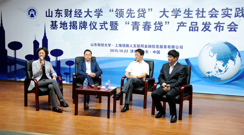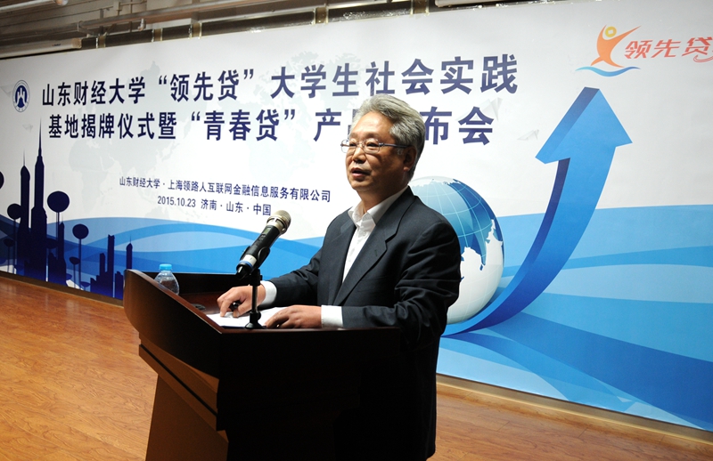 2015年10月23日,山东财经大学“领先贷”大学生社会实践基地揭牌仪式暨“青春贷”产品发布会、上海校友会返校活动在大学生创业园隆重举行。副校长胡文波、上海领路人互联网金融信息服务有限公司创始人兼董事长朱上民、联合创始人兼CEO 陈济、首席市场总监卞贞兵、首席风险官吴晨彤、首席公关总监章佳錡、董事长助理陈彦磊、领路人照明副总经理许志平、上海校友会副会长黄晶、周贵银以及校友工作办公室、学生工作处、就业处、团委、工商管理学院、国际贸易学院、管理科学与工程学院、计算机科学与技术学院等负责人及100余名学生代表出席了活动。活动由校友工作办公室主任耿金波主持。