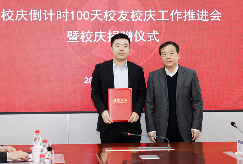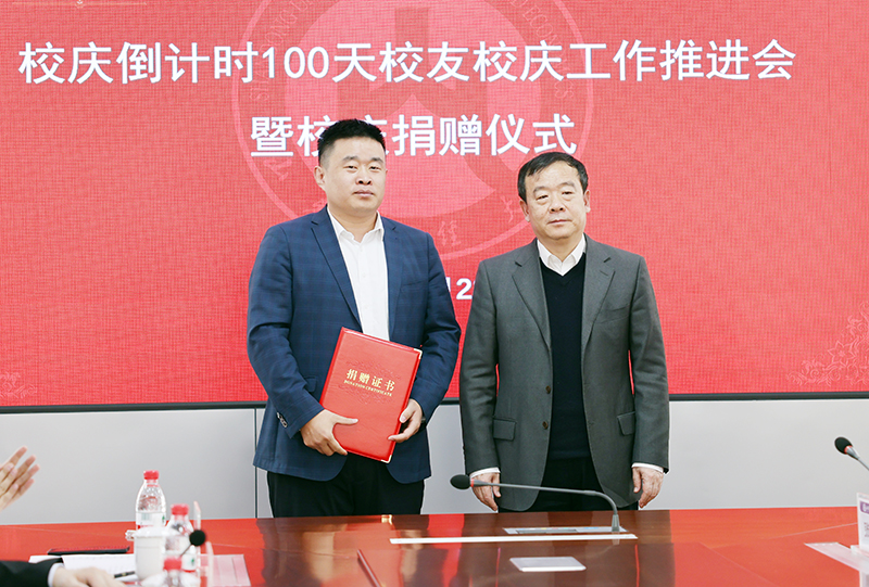 王邵军在讲话中向一直以来关心支持学校教育事业发展的广大校友、各界朋友表示衷心感谢!向捐赠嘉宾慷慨捐赠表示崇高敬意!向所有为校庆筹备工作而付出智慧和汗水的同志们表示衷心感谢!他指出,在校庆倒计时100天之际,我校教授、年轻校友,还有社会企业向学校校庆捐赠,让我们特别感动,也很受鼓舞。范正红教授艺术作品捐赠充分体现了他来校从教25年来对学校热爱之情深厚绵长,将有效助力我校文化艺术学科和专业建设;中铁建工集团山东公司捐资助力学校发展充分体现了企业的社会责任担当;李庆新校友向广大校友发起学校燕山校区文体馆捐建倡议并进行捐资,李欣、贾需校友为校庆捐资等,都充分体现了财大校友的拼搏精神和感恩情怀。