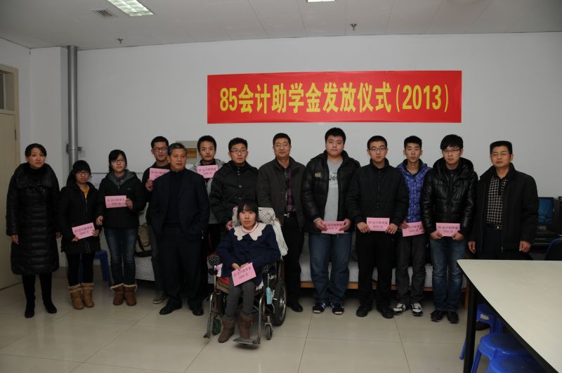 2013年12月19日下午,“85会计助学金”发放仪式在燕山校区逸夫楼举行。校友办公室主任、教育基金会秘书长耿金波,会计学院党总支副书记杨扬,85级会计专业校友代表董擎、宋希亮应邀出席,“85会计助学金”2013年受助学生参加了此次仪式。