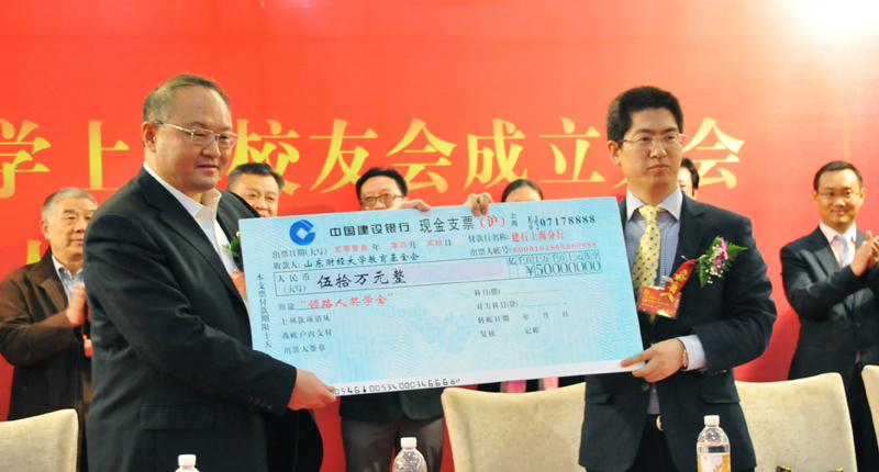 2013年4月20日,在山东财经大学上海校友会成立之际,2001级校友上海领路人照明工程有限公司董事长朱上民为母校捐助50万元设立“领路人奖学金”,助力学校发展建设。校长刘兴云、资深校友中国建设银行上海分行行长王江以及学校党委办公室、校友办公室、山东财政职工大学负责同志、上海校友会会长郭晓天、上海领路人照明工程有限公司部分高管等与260名校友出席了捐赠仪式。刘兴云代表学校接受捐款,并为朱上民校友颁发捐赠证书。