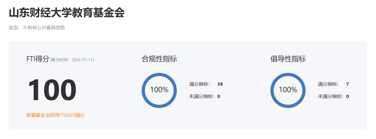 1月12日,中国基金会行业数据发布会在北京召开,会议发布了中基透明指数FTI2023报告。山东财经大学教育基金会获得了100分的成绩,是山东省省属高校唯一一家获得满分的基金会。