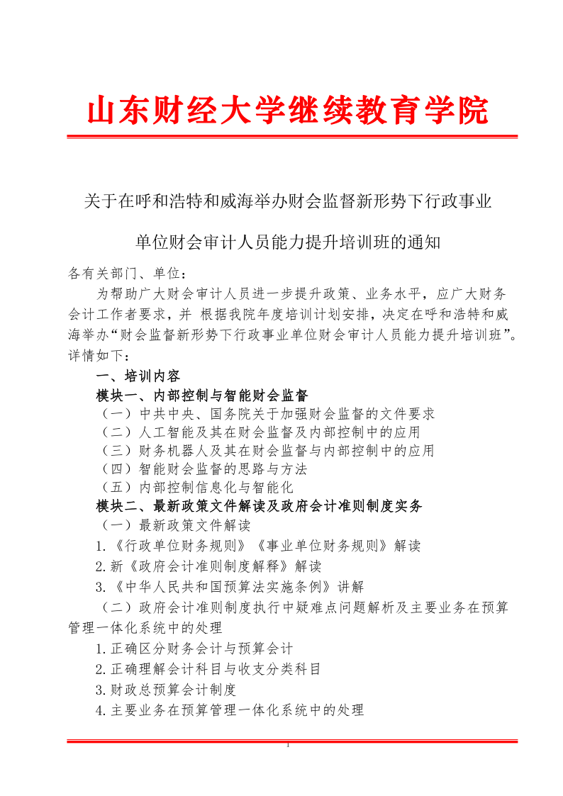 为帮助广大财会审计人员进一步提升政策、业务水平,应广大财务会计工作者要求,并 根据我院年度培训计划安排,决定在呼和浩特和威海举办“财会监督新形势下行政事业单位财会审计人员能力提升培训班”。详情如下: