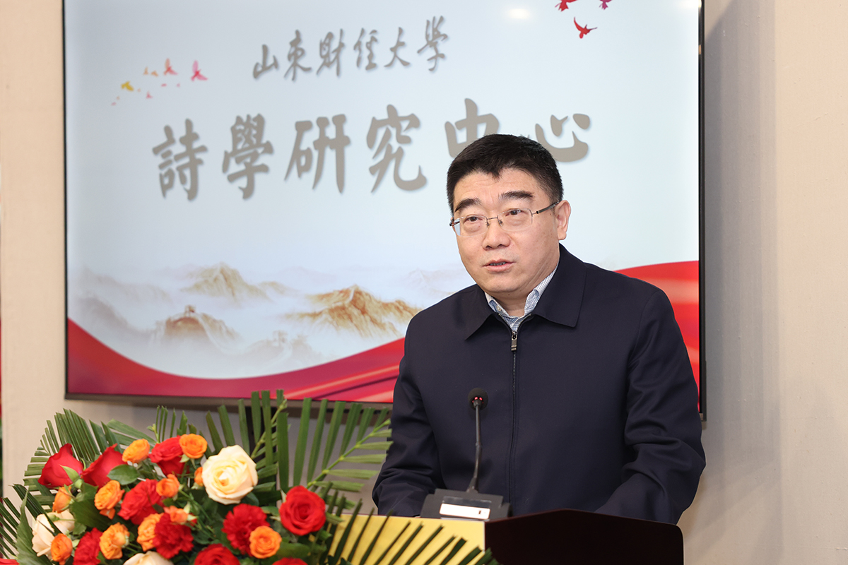 赵艺丁在致辞中对诗学研究中心的成立表示热烈的祝贺,认为这是山东财经大学为传承中华文化、推动文化繁荣所做的一件大事、好事,也是全省文学界非常值得庆贺的一件大事、喜事。他在回顾了山东自古以来的优良文学传统、阐述了当代山东文学以及山东诗坛的创作盛况后,祝愿我校诗学研究中心在今后的诗学创作和研究中,扎根齐鲁文化沃土,赓续历史文脉,谱写当代华章,开展多层次、全方位的文学艺术创作及理论研究,把诗学研究中心打造成为国内独具特色、实力雄厚的诗学文化研究基地,为推进文化强省建设、打造中华民族现代文明高地做出积极贡献。