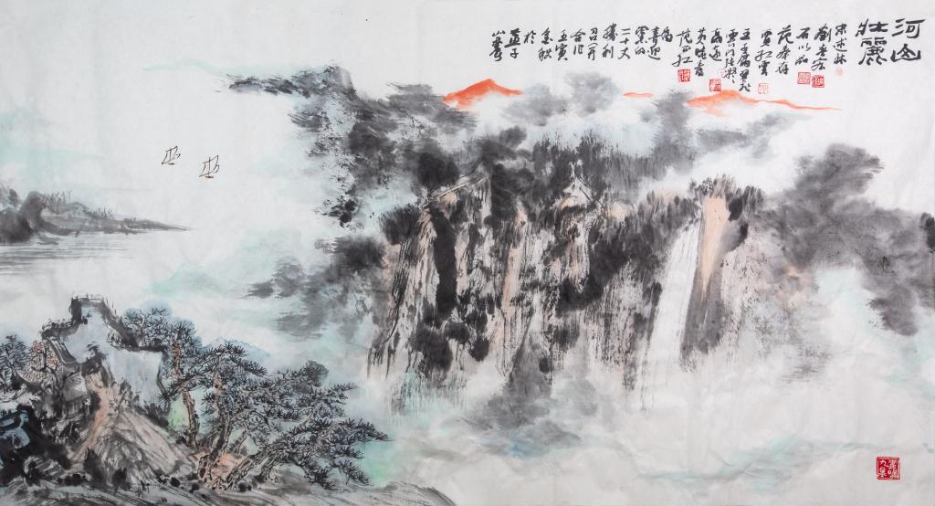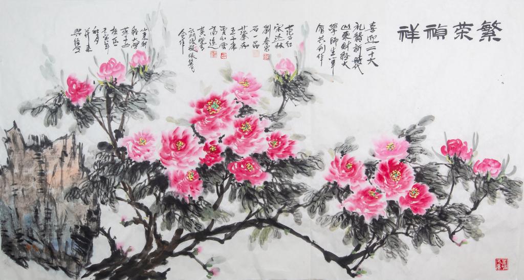 笔会现场,学院师生以饱满的热情、振奋的精神,以笔代言、以书言志、以画寄情,各展所长,精心构思,凝心创作,把对党和国家的无限热爱之情融注笔端,尽情展现对党更加辉煌、国家更富强、人民更幸福的殷切祝福。历经三个多小时,师生联合创作六尺整张山水、花鸟各一幅,书法绘画作品二十多幅,作品紧扣主题,体裁形式丰富。齐鲁文化名家、艺术学院名誉院长范正红教授领衔创作的《河山壮丽》,气势恢宏,构图大气,生动描绘了神州大地的无边锦绣;省政协常委刘春宏教授领衔创作的《繁荣祯祥》,色彩绚烂,鲜艳欲滴,以20朵绽放的牡丹表达对党的二十大即将开幕的美好祝福。