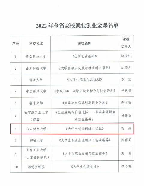 2022年8月4号,山东省人力资源和社会保障厅发布《关于公布2022年全省高校就业创业金课和职业生涯咨询特色工作室的通知》,我校推荐申报的《大学生创业训练与实践》课程获评山东省高校就业创业金课,入选全省创业就业金课课程库。2022年全省高校就业创业金课评选工作由省人力资源社会保障厅负责组织实施,经过高校推荐、专家评审等流程,最终10门课程确定为全省高校就业创业金课。
