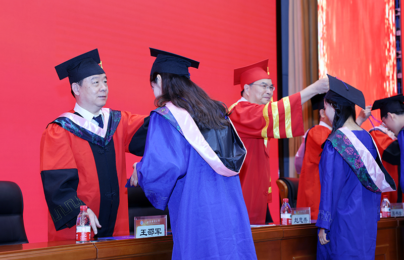 身着不同学位服的毕业生依次走上前台,校领导一一与其握手、拨穗、颁发学位证书,会场充满了收获的喜悦和彼此的祝福。