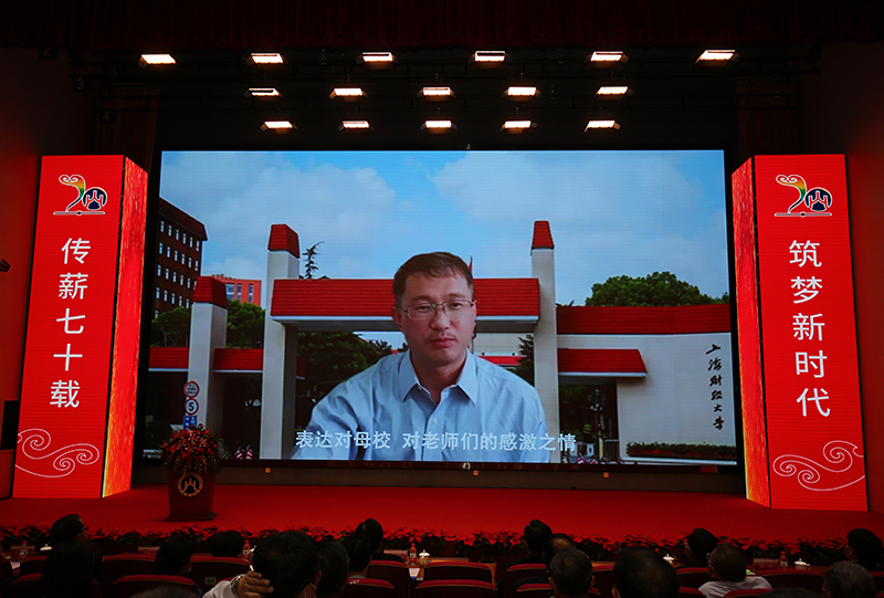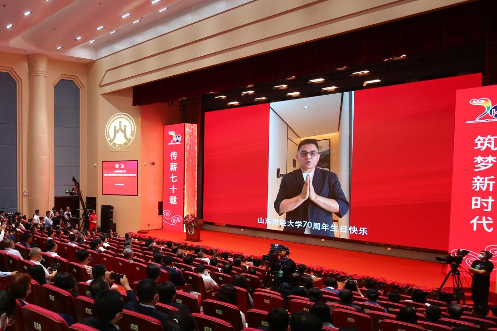 审计署党组成员、中央经济责任审计工作部际联席会议办公室主任、山东财经大学原党委书记郝书辰,中国光大集团股份公司党委书记、董事长、1980级校友王江,上海财经大学校长助理、长江学者、1993级校友李增泉,洪泰基金创始合伙人、董事长、1985级校友盛希泰等通过视频,表达了对山东财经大学70华诞的美好祝福。他们的祝福视频在会场播放,赢得了阵阵掌声。