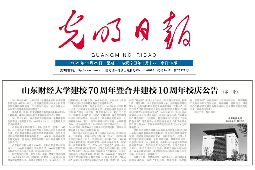 2022年6月9日,山东财经大学将迎来建校70周年暨合并建校10周年。在此,我们谨向长期以来关心和支持学校发展的各级领导、广大海内外校友、社会各界友人致以衷心的感谢和崇高的敬意! 风雨七秩,倚泰山临黄河根植齐鲁写就高教隽永篇章;十载砥砺,逢盛世沐国运勃发英姿频传兴学育才弦歌。 2011年7月4日,原山东经济学院和原山东财政学院合并筹建山东财经大学;2012年6月9日,山东财经大学正式揭牌成立。 山东经济学院的前身山东财经学院,创建于1952年,由山东会计专科学校与齐鲁大学的经济系合并组建而成,是山东省建校最早的财经类普通高校,也是全国建校最早的财经类普通高校之一。1978年,经国务院批准恢复办学,更名为山东经济学院。1993年获得硕士学位授予权。 山东财政学院始建于1986年,是财政部直属六所高校之一。1998年获得硕士学位授予权。2000年学校管理体制改为中央与地方共建、以地方管理为主。 财政是庶政之母,邦国之本;金融,是现代经济的核心。2012年8月23日,财政部、教育部、山东省人民政府在济南签署协议,共建山东财经大学。2013年7月,学校获得博士学位授予权。2013年12月,学校入选山东省“省部共建人才培养特色名校立项建设单位”。 发展未有穷期,奋进永不言止。2017年12月学校第一次党代会明确了全面建成全国一流财经特色名校发展目标和“坚定一流目标,贯穿两条主线,突出三个重点,实施四大战略”的“1234”发展思路。在教育部第四轮学科评估结果中,学校两个一级学科应用经济学、工商管理为B+,两个一级学科管理科学与工程、公共管理为B-,成为有两个以上B+学科的三所省属高校之一,成为山东省唯一拥有B以上经管学科的省属高校,整体学科实力进入全国财经高校前10名。 学校现有应用经济学博士后科研流动站,应用经济学、工商管理、管理科学与工程、统计学4个一级学科博士学位授权点,11个一级学科硕士学位授权点,15种硕士专业学位类别。现有国家级一流本科专业25个,国家级一流本科课程12门。在2016年“创青春”全国大学生创业大赛中获3项全国金奖,团体总分位列第19名,并获得“优胜杯”。2018—2019年获中国“互联网+”大学生创新创业大赛金奖1项、银奖2项;2019年获“创青春”中国青年创新创业大赛省内唯一的1项全国金奖、“挑战杯”全国大学生课外学术科技作品大赛一等奖1项。2020年获“挑战杯”中国大学生创业计划竞赛金奖1项、银奖2项、铜奖3项,以山东省高校第1名、全国财经类院校第1名、全国高校第31名的优异成绩捧得“优胜杯”。与济南市历下区人民政府共建的大学生创业园获评教育部“全国高校实践育人创新创业基地”。2020年12月,学校入选山东省高水平大学建设高校,应用经济学入选“高峰学科”建设学科,工商管理、管理科学与工程进入“优势特色学科”建设名单;应用经济学进入“中国最好学科”排名前10%,工程学和计算机学科先后进入ESI全球排名前1%。 建校70周年暨合并建校10周年是学校全面建成全国一流财经特色名校的重要里程碑,更是学校接续内涵式发展、高质量发展的崭新起点。面向新时代,山财大人将以这次校庆为契机,总结辉煌成就,展现时代风采,再创美好未来。立足新起点,山东财经大学将全面贯彻党的教育方针,坚持社会主义办学方向,永葆为党育人之初心,牢记为国育才之使命,落实立德树人根本任务,在全面建成全国一流财经特色名校的新征程上矢志不渝,行稳致远,倍道兼行。 传薪七十载,筑梦新时代。2022年6月,我们将在美丽的泉城济南,本着“文化引领、聚焦学术、热烈隆重、节俭务实”的原则举行一系列庆祝活动,热切期待广大海内外校友拨冗莅临,共襄盛典,畅叙情谊;诚邀关心支持学校发展的各级领导和社会各界朋友共话美好未来、同谱盛世华章! 特此公告,敬祈周知。 山东财经大学 2021年11月22日 光明日报链接:https://app.gmdaily.cn/as/opened/n/44cef71a7baf4dfbababe4a3550f5718 |