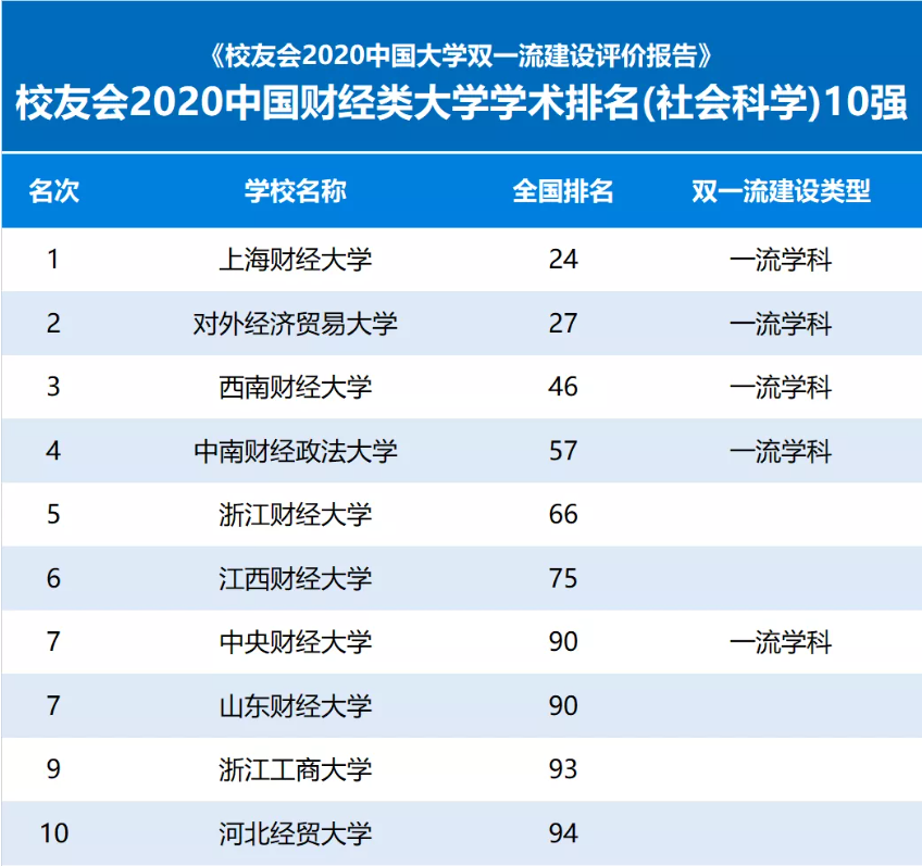 上海财经大学、对外经济贸易大学、西南财经大学、中南财经政法大学、浙江财经大学、江西财经大学、中央财经大学、山东财经大学、浙江工商大学、河北经贸大学勇夺2020中国财经类大学学术排名(社会科学)前10名。
