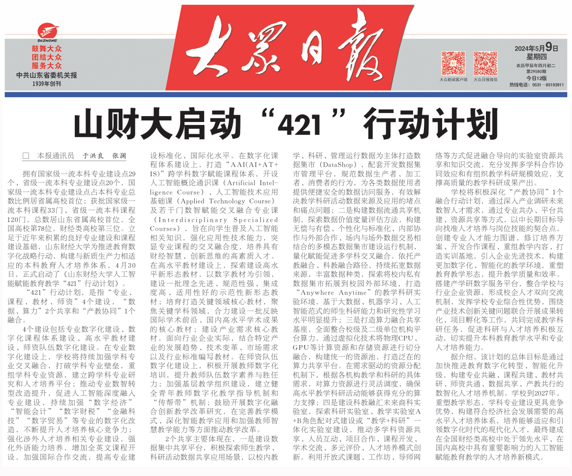 本报通讯员 于洪良 张澜 拥有国家级一流本科专业建设点29个、省级一流本科专业建设点20个,国家级一流本科专业建设点占本科专业总数比例居省属高校首位;获批国家级一流本科课程33门、省级一流本科课程120门,总数居山东省属高校首位,全国高校第78位,财经类高校第三位。立足于近年来积累的良好专业建设和课程建设基础,山东财经大学为推进教育数字化战略行动,构建与新质生产力相适应的本科教育人才培养体系,4月30日,正式启动了《山东财经大学人工智能赋能教育教学“421”行动计划》。 “421”行动计划,是指“专业、课程、教材、师资”4个建设,“数据、算力”2个共享和“产教协同”1个融合。 4个建设包括专业数字化建设、数字化课程体系建设、高水平教材建设、师资队伍数字化建设。在专业数字化建设上,学校将持续加强学科专业交叉融合,打破学科专业壁垒,重组学科专业资源,建立跨学科专业研究和人才培养平台;推动专业数智转型改造提升,促进人工智能深度融入专业建设,持续加强“数字经济”“智能会计”“数字财税”“金融科技”“数字贸易”等专业的数字化改造,不断提升人才培养核心竞争力;强化涉外人才培养相关专业建设,强化外语能力培养,增加全英文课程开设,加强国际合作交流,提高专业建设标准化、国际化水平。在数字化课程体系建设上,打造“AAI(AI+AT+IS)”跨学科数字赋能课程体系,开设人工智能概论通识课(Artificial Intelligence Course)、人工智能技术应用基础课(Applied Technology Course)及若干门数智赋能交叉融合专业课(Interdisciplinary Specialized Courses),旨在向学生普及人工智能相关知识,强化应用性技术能力,突显专业课程的交叉融合度,培养具有财经智慧、创新思维的高素质人才。在高水平教材建设上,探索建设高水平新形态教材,以数字教材为引领,建设一批理念先进、规范性强、集成度高、适用性好的示范性新形态教材;培育打造关键领域核心教材,聚焦关键学科领域,合力建设一批反映国际学术前沿、国内高水平学术成果的核心教材;建设产业需求核心教材,面向行业企业实际,结合特定产业的发展趋势、技术变革、市场需求以及行业标准编写教材。在师资队伍数字化建设上,积极开展教师数字化培训,提升教师队伍数字素养与胜任力;加强基层教学组织建设,建立健全青年教师数字化教学指导机制和“传帮带”机制;鼓励开展数字化融合创新教学改革研究,在完善教学模式、深化智能教学应用和加强教师智慧教学能力等方面推动教学改革。 2个共享主要体现在,一是建设数据集中共享平台,积极探索师生教学、科研活动数据共享应用场景,以校内教学、科研、管理运行数据为主体打造数据集市(DataShop),配套开发数据集市管理平台,规范数据生产者、加工者、消费者的行为,为各类数据使用者提供便捷安全的数据访问服务,有效解决教学科研活动数据来源及应用的堵点和痛点问题;二是构建数据流通共享机制,探索数据价值度量评估方法,构建无偿与有偿、个性化与标准化、内部协作与外部合作、场内与场外数据交易相结合的多模态数据集市建设运行机制,量化赋能促进多学科交叉融合。依托产教融合、科教融合路径,持续拓宽数据来源,丰富数据种类,探索将校内私有数据集市拓展到校园外部环境,打造“Anywhere Anytime”的教学科研实验环境,基于大数据、机器学习、人工智能范式的师生科研能力和研究性学习水平明显提升;三是打造算力融合共享基座,全面整合校级及二级单位机构平台算力,通过虚拟化技术将物理CPU、GPU等计算资源和存储资源进行切分融合,构建统一的资源池,打造泛在的算力共享平台。在需求驱动的资源分配机制下,根据各机构教学和科研的具体需求,对算力资源进行灵活调度,确保高水平教学科研活动能够获得充分的算力支撑;四是建设科教融汇未来商科实验室,探索科研实验室、教学实验室A+B角色配对式建设或“教学+科研”一体化实验室建设,推动多学科资源共享、人员互动、项目合作、课程开发、学术交流、多元评价、人才培养模式创新。利用开放式课题、工作坊、导师网络等方式促进融合导向的实验室资源共享和知识交流,充分发挥多学科合作协同效应和有组织教学科研规模效应,支撑高质量的教学科研成果产出。 学校将积极深化“产教协同”1个融合行动计划,通过深入产业调研未来数智人才需求,通过专业共办、平台共建、资源共享等方式,以中长期目标导向找准人才培养与岗位技能的契合点,创建专业人才能力图谱,修订培养方案、开发合作课程、重组教学内容、打造实训基地,引入企业先进技术,构建更加数字化、智能化的教学环境,重塑教育教学形态,提升教学质量和效率。搭建产学研数字服务平台,整合学校与行业企业资源,形成校企人才双向交流机制,发挥学校专业综合性优势,围绕产业技术创新关键问题联合开展成果转化、项目孵化等工作,共同完成教学科研任务,促进科研与人才培养积极互动,切实提升本科教育教学水平和专业人才培养能力。 据介绍,该计划的总体目标是通过加快推进教育数字化转型、智能化升级,构建专业共融、课程共建、教材共研、师资共通、数据共享、产教共行的数智化人才培养机制。学校到2027年,重塑教学形态,学科专业建设更具竞争优势,构建符合经济社会