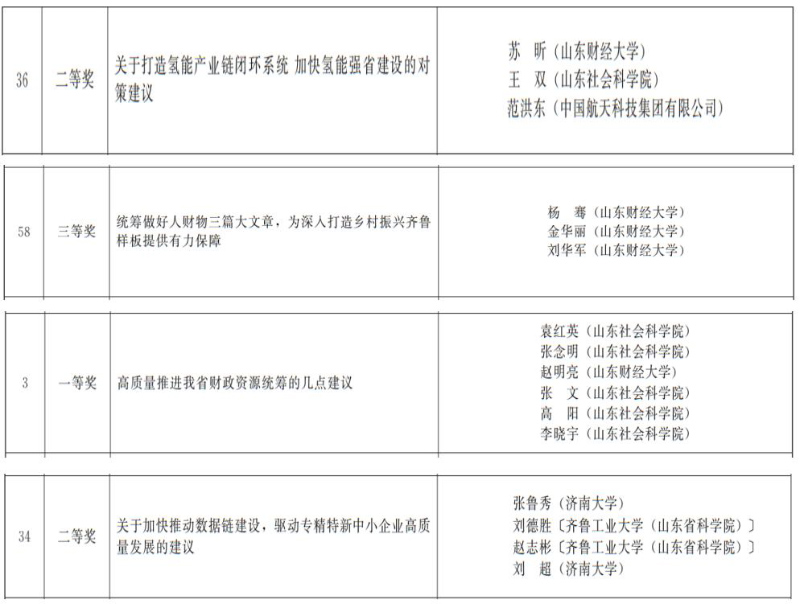 在山东省人民政府决策咨询奖评选中,我校4位教师获得表彰,获奖数量位居全省高校前列。其中,苏昕教授团队的研究成果《关于打造氢能产业链闭环系统,加快氢能强省建设的对策建议》获二等奖;杨骞教授团队的研究成果《统筹做好人财物三篇大文章,为深入打造乡村振兴齐鲁样板提供有力保障》获三等奖;赵明亮教授作为第三完成人参与的研究成果《高质量推进我省财政资源统筹的几点建议》获一等奖;新引进人才张鲁秀教授在济南大学工作期间主持完成的研究成果《关于加快推动数据链建设,驱动专精特新小企业高质量发展的建议》获二等奖。这些获奖成果紧密围绕山东省重大发展战略需求,在新能源、乡村振兴、财政管理、数字经济等重点领域形成了具有重要参考价值的研究成果,充分彰显了我校在决策咨询领域的学术影响力和社会服务能力。