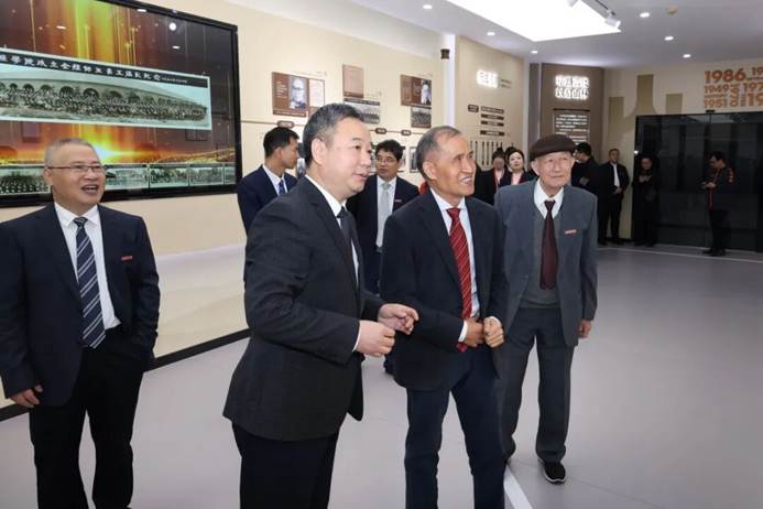 在热烈的掌声下,查玉喜、洪俊杰、张体勤、姜宗俊共同为办学成就展揭幕,并与校友代表合影留念。