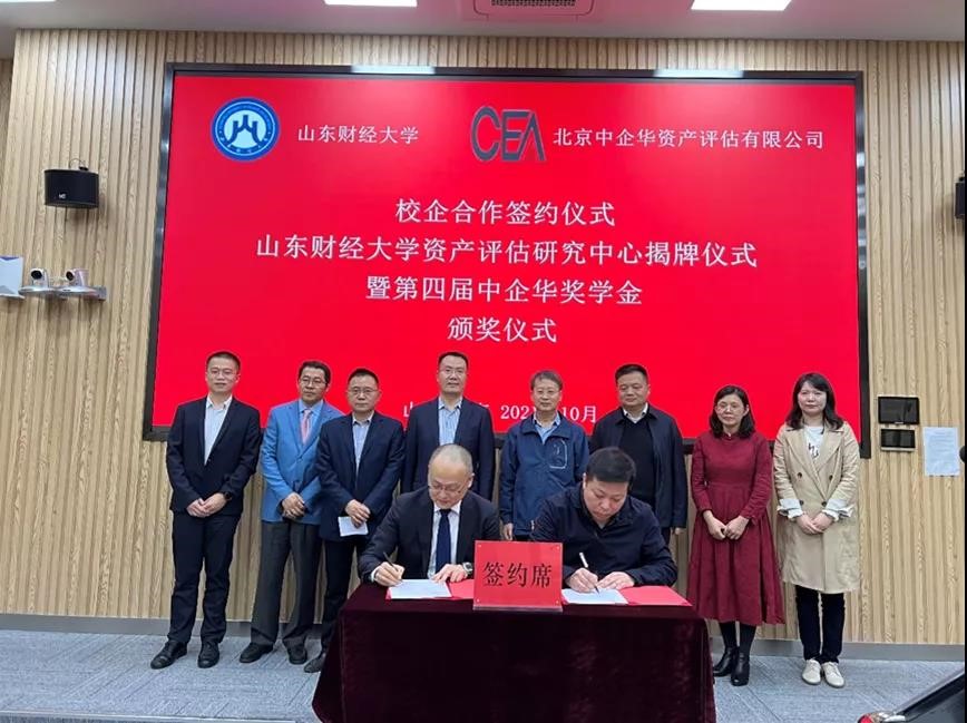 10月15日,山东财经大学、北京中企华资产评估有限责任公司校企合作签约仪式在燕山校区举行,校党委副书记韩作生,北京中企华资产评估有限责任公司总裁刘登清,中企华山东分公司总经理尤建宏、副总经理周生岩出席仪式。山东财经大学资产评估研究中心揭牌仪式、中企华科研基金捐赠仪式、刘登清客座教授聘书颁发仪式、第四届中企华奖学金颁奖仪式同时举行。