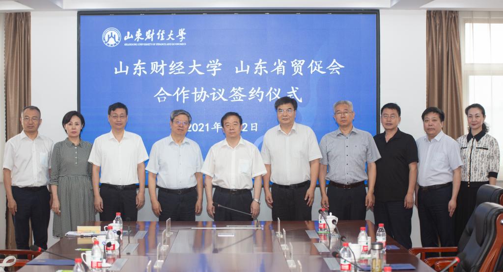 2021年7月2日,山东财经大学与中国国际贸易促进委员会山东省委员会(简称:山东省贸促会)合作协议签约仪式在燕山校区举行。山东省贸促会党组书记、会长于风贵、副会长贺忠军、秘书长陈彤,学校党委书记王邵军、校长赵忠秀、副校长张新出席签约仪式并进行座谈。王邵军、于风贵致辞,张新、贺忠军分别代表双方签约,赵忠秀主持签约仪式。