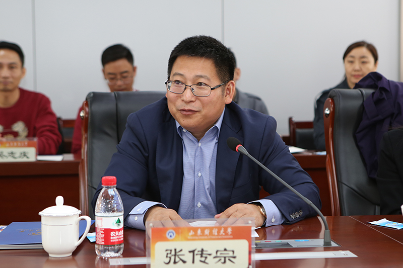 张传宗介绍了肆拾玖坊的发展情况、企业理念和价值观。他表示,山东财经大学办学历史悠久,学科特色优势明显,在人才培养和教学科研等方面取得了令人敬佩的成就,为肆拾玖坊的成立、发展输送了大批人才。他阐述了肆拾玖坊在重点高校捐赠设立基金的初衷和愿景,希望在企业破局重构、快速扩张发展的重要时期,深化与山东财经大学的校企合作,共同致力于高质量创新创业人才培养。