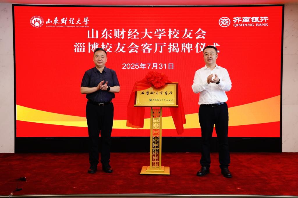 张新与王涛代表双方签署战略合作协议。查玉喜与李大鹏共同为“山东财经大学社会实践基地”“山东财经大学校友会淄博校友会客厅”揭牌。