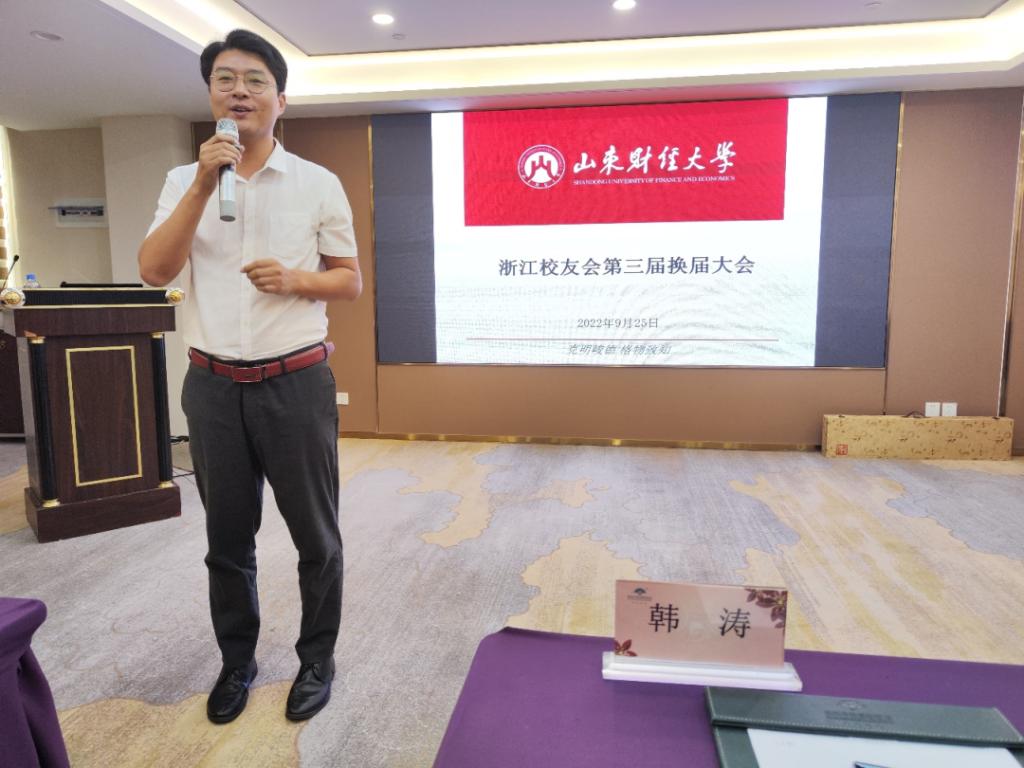 韩涛代表山东财经大学浙江校友会第二届理事会做了理事会工作汇报。他表示浙江校友会的各项工作得到了学校的大力支持,通过此次换届,浙江校友会工作做到有序传承,不断补充新鲜血液,继续服务校友发展、服务母校建设。
