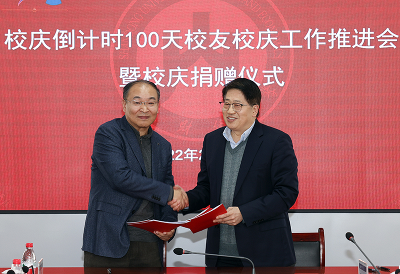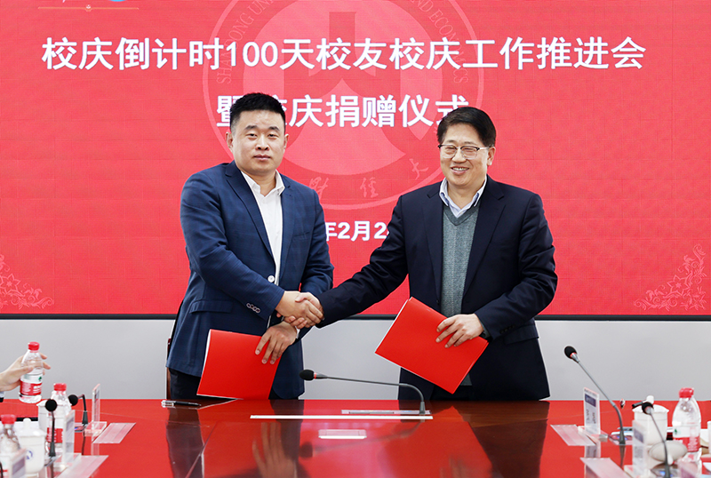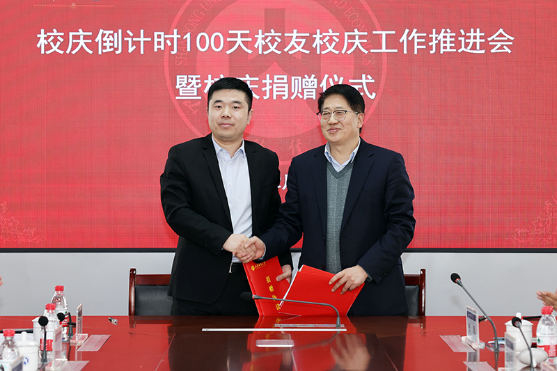 王邵军在讲话中向一直以来关心支持学校教育事业发展的广大校友、各界朋友表示衷心感谢!向捐赠嘉宾慷慨捐赠表示崇高敬意!向所有为校庆筹备工作而付出智慧和汗水的同志们表示衷心感谢!他指出,在校庆倒计时100天之际,我校教授、年轻校友,还有社会企业向学校校庆捐赠,让我们特别感动,也很受鼓舞。范正红教授艺术作品捐赠充分体现了他来校从教25年来对学校热爱之情深厚绵长,将有效助力我校文化艺术学科和专业建设;中铁建工集团山东公司捐资助力学校发展充分体现了企业的社会责任担当;李庆新校友向广大校友发起学校燕山校区文体馆捐建倡议并进行捐资,李欣、贾需校友为校庆捐资等,都充分体现了财大校友的拼搏精神和感恩情怀。