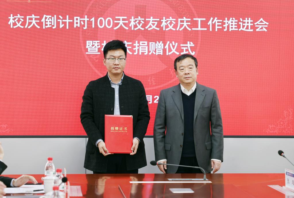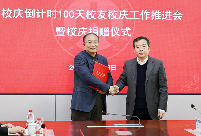 在校庆捐赠仪式上,齐鲁文化名家、西泠印社理事、中国书法家协会理事、山东印社社长、我校艺术学院院长范正红教授向学校无偿捐赠其书画、篆刻、绘瓷等艺术精品100件,经山东省艺术品鉴定委员会鉴定总估价642.6万元。中铁建工集团山东有限公司党委副书记、工会主席、副总经理孙建功,副总经理冯明耀代表公司向我校校庆捐资200万元。山东新天地集团董事长、2005级会计专业校友李庆新向母校首批捐赠300万元并向广大校友发起燕山校区校友文体馆捐建倡议。济南远业长盈国际贸易有限公司总经理、2007级国贸专业校友李欣,副总经理2007级国贸专业校友贾需向母校校庆捐资70万元。