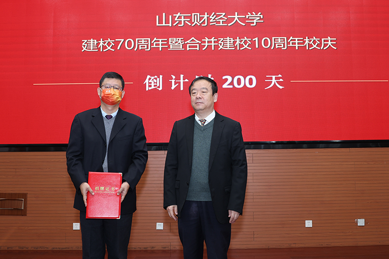 上午10时整,燕山校区图书馆报告厅内全体起立,国歌响起。会场正前方的电子屏幕上,学校校标和校庆徽标并排而立,红底白字的“山东财经大学建校70周年暨合并建校10周年校庆倒计时200天”字样,赏心悦目,会场充满了一派喜庆祥和气象。