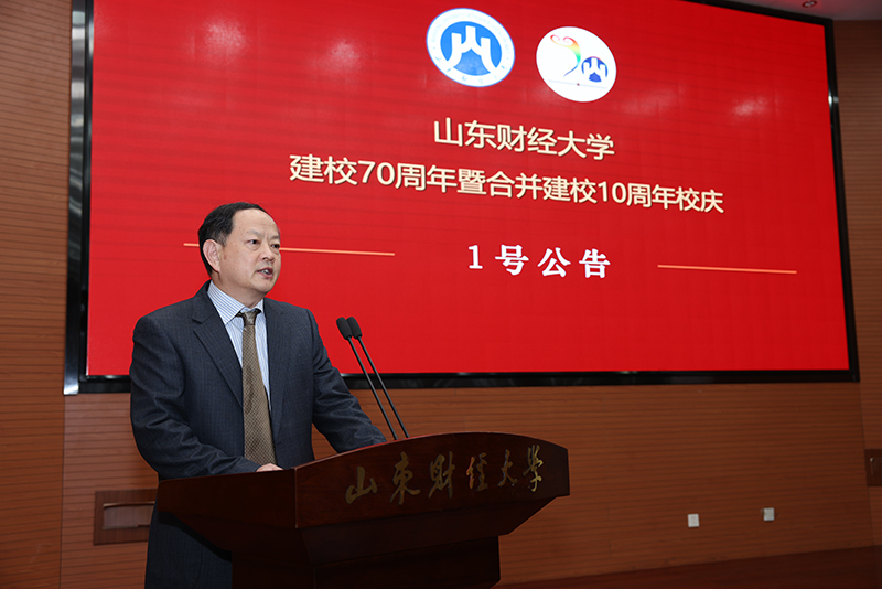 校党委副书记赵友春宣读了刊发在当天《光明日报》的《山东财经大学建校70周年暨合并建校10周年校庆1号公告》,并宣布了校庆主题:传薪七十载,筑梦新时代。