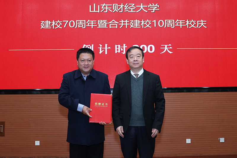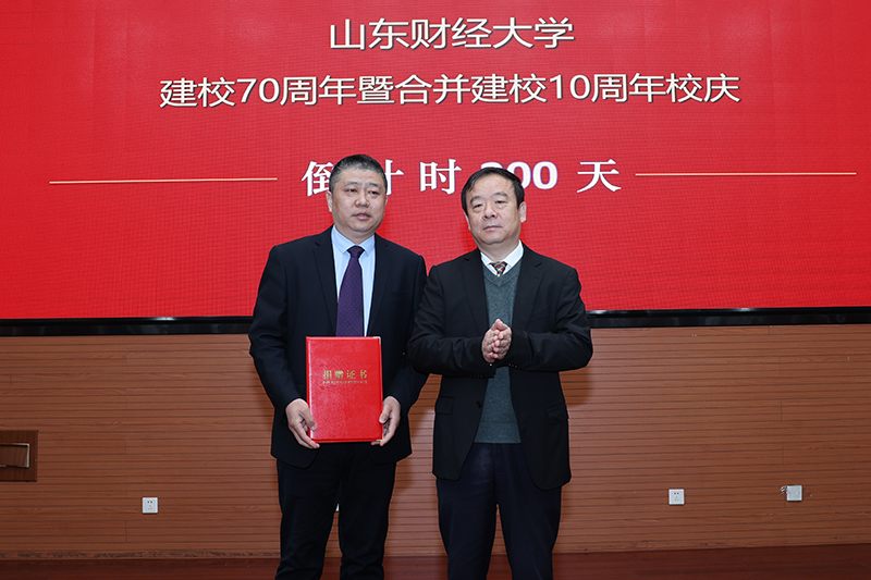 在欢快的乐曲中,校党委书记、山东财经大学校友会会长、教育基金会理事长王邵军向校庆70周年之际为学校捐赠的董方军、崔建忠、付安平、王汉领、黄军杰颁发了捐赠证书。
