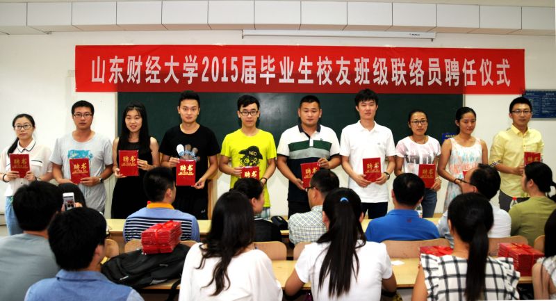 出席活动的老师为联络员颁发了聘书。学生工作处处长王剑、副处长于栋宣读了联络员名单,就业指导处副处长魏莉莉宣读了《山东财经大学校友工作联络员工作职责》。耿金波介绍了校友总会、各地校友会的情况,希望各位校友联络员认真履行职责,不辜负母校、广大同学的期望,为学校发展、校友联络做好服务工作。