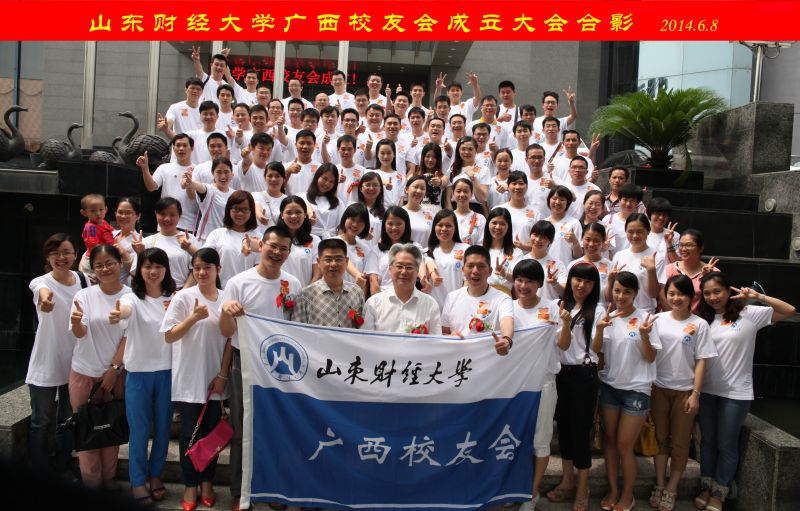 2014年6月7至8日,山东财经大学广西校友会成立大会在南宁金钻国际大酒店举行,副校长、校友总会副会长胡文波到会讲话并为广西校友会授会旗。来自广西各地的近100名校友代表以及专程从北京、山东等地赶赴南宁的广西籍校友参加了成立大会。青岛校友会常务副秘书长陈明专程到会祝贺,上海、北京等校友会发来贺信。