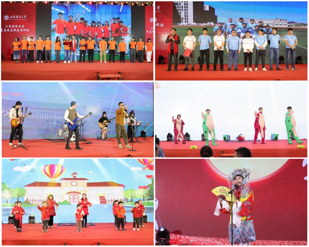 晚会环节,青岛校友读书协会、高尔夫球协会、羽毛球协会、足球协会、掼蛋协会等组织以及校企联的校友们依次登台亮相,介绍了各自的宣言、活动开展情况,并为大家送上新春的祝福。可爱的财二代小朋友、充满青春活力的校友为大家带来了精心准备的节目,“青”年“财”俊乐队演唱的《曾经的你》和《再回首》,青蛙组合表演的舞蹈“科目三”、戏曲《贵妃醉酒》等节目,将整个活动推向高潮,欢声笑语洋溢整个会场。
